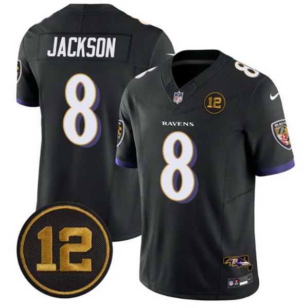 Home>NFL>Baltimore Ravens>Men>Men Baltimore Ravens 8 Lamar Jackson Black 2025 F U S E Jacoby Jones Patch Vapor Limited Football Jersey