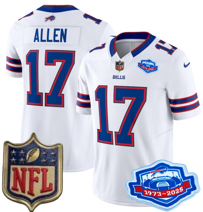 Men Buffalo Bills 17 Josh Allen White 2025 F U S E Farewell Season Gold Shield Patch Stitched Football Jersey