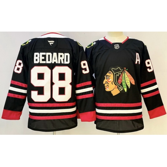 Men Chicago Blackhawks 98 Connor Bedard Black With A Patch Stitched Hockey Jersey