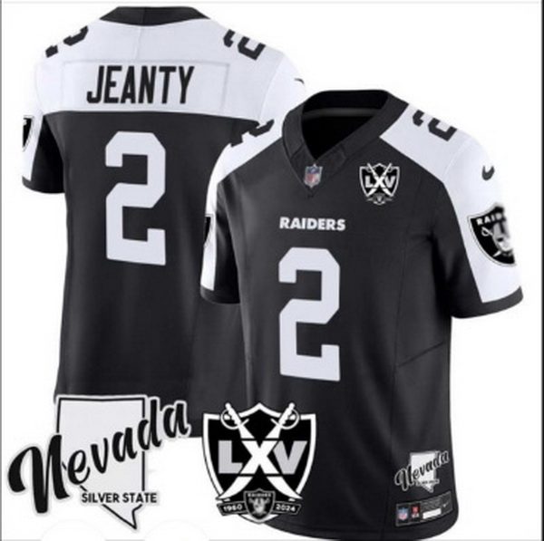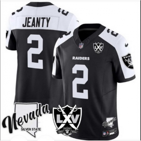 Home>NFL>Las Vegas Raiders>Men>Men Las Vegas Raiders 2 Ashton Jeanty Black 2024 F U S E With Nevada Silver Stat Patch And 65th Anniversary Patch Stitched Football Jersey