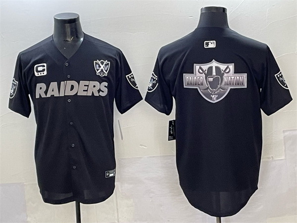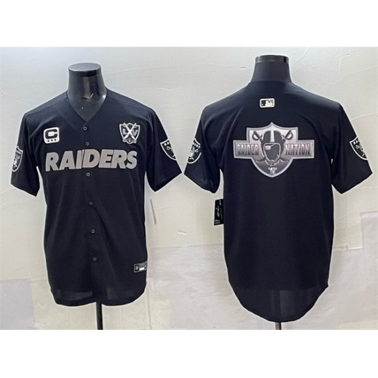 Home>NFL>Las Vegas Raiders>Men>Men Las Vegas Raiders Team Big Logo Black With Nevada Silver Stat Patch And 65th Anniversary Patch 3 Star C Patch Stitched Baseball Jersey