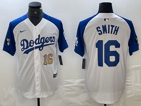 Men Los Angeles Dodgers 16 Will Smith White Blue Vin Patch Cool Base Stitched Baseball Jersey 7