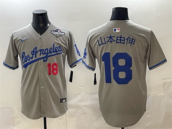 Home>MLB>Los Angeles Dodgers>Men>Men Los Angeles Dodgers 18 Yoshinobu Yamamoto Grey 2025 World Series Patch Limited Stitched Baseball Jersey