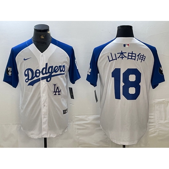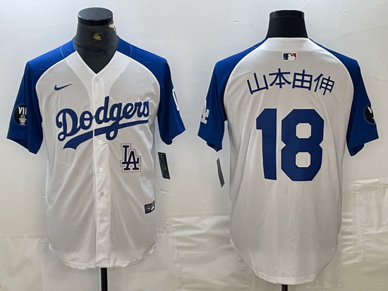 Men Los Angeles Dodgers 18 Yoshinobu Yamamoto White Blue Vin Patch Cool Base Stitched Baseball Jersey B