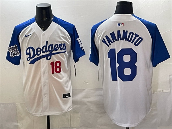 Home>MLB>Los Angeles Dodgers>Men>Men Los Angeles Dodgers 18 Yoshinobu Yamamoto White Royal 2025 World Series Champions Patch Limited Stitched Baseball Jersey
