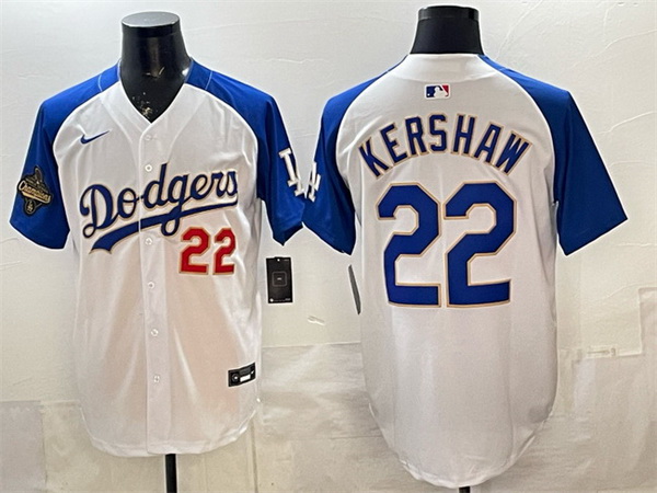 Home>MLB>Los Angeles Dodgers>Men>Men Los Angeles Dodgers 22 Clayton Kershaw White Royal 2025 World Series Champions Patch Limited Stitched Baseball Jersey