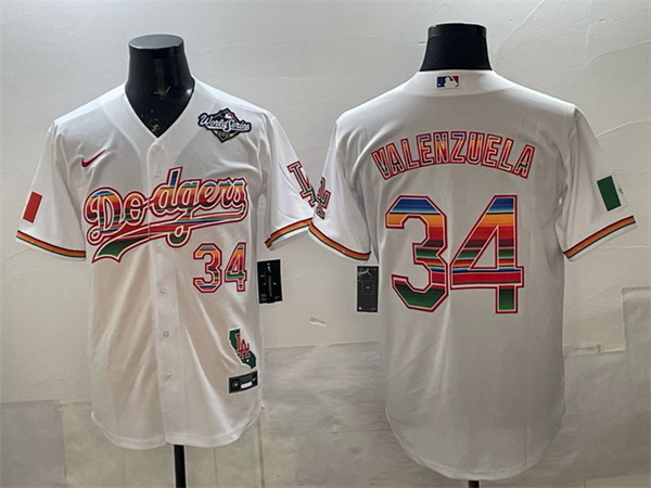 Home>MLB>Los Angeles Dodgers>Men>Men Los Angeles Dodgers 34 Fernando Valenzuela White Mexico California Patch 2025 World Series Patch Stitched Baseball Jersey