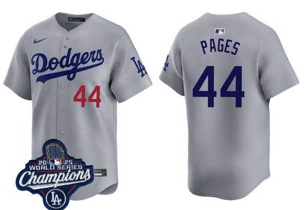 Home>MLB>2025 World Series>Los Angeles Dodgers Champions>Men Los Angeles Dodgers 44 Andy Pages Cool Base 2025 World Champions Stitched Baseball Jersey Gray