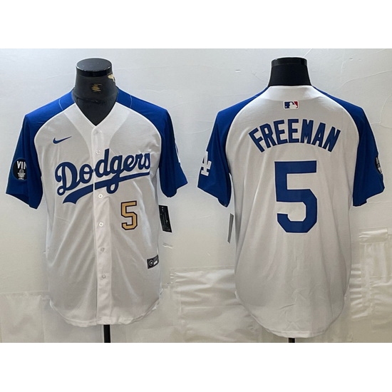 Home>MLB>Los Angeles Dodgers>Men>Men Los Angeles Dodgers 5 Freddie Freeman White Blue Vin Patch Cool Base Stitched Baseball Jersey