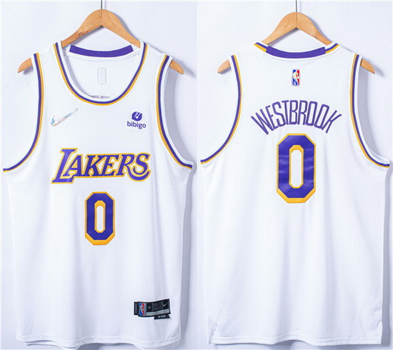 Home>NBA>Los Angeles Lakers>Men>Men Los Angeles Lakers 0 Russell Westbrook 75th Anniversary Bibigo White Stitched Basketball Jersey
