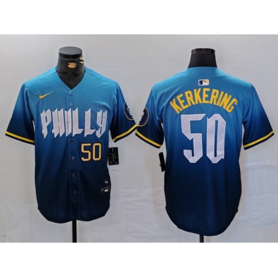 Men Philadelphia Phillies 50 Orion Kerkering Blue 2024 City Connect Limited Stitched Jersey 2