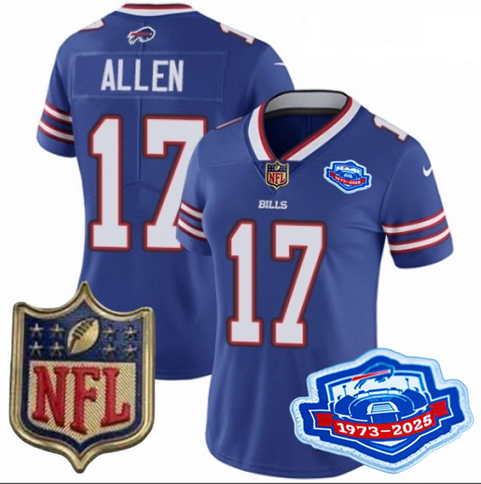 Women Buffalo Bills 17 Josh Allen Blue 2025 F U S E Farewell Season Gold Shield Patch Stitched Football Jersey