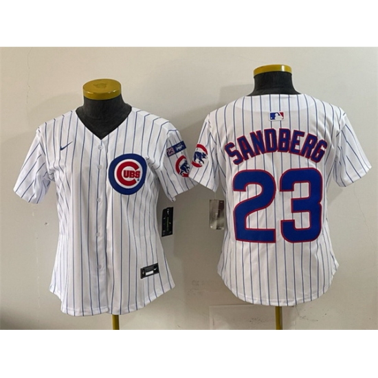 Home>MLB>Chicago Cubs>Women>Women Chicago Cubs 23 Ryne Sandberg White Pinstripe Ryne Sandberg Tribute Vapor Limited V3 Stitched Baseball Jersey