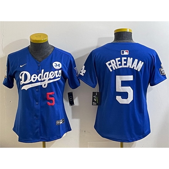 Women Los Angeles Dodgers 5 Freddie Freeman Royal 2024 World Series With No 34 Patch Alternate Limited Stitched Baseball Jersey