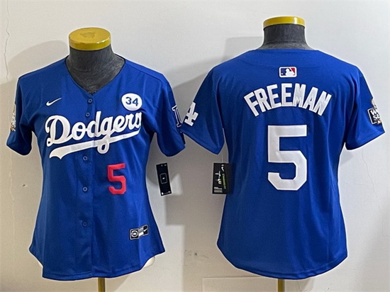 Home>MLB>Los Angeles Dodgers>Women>Women Los Angeles Dodgers 5 Freddie Freeman Royal 2024 World Series With No 34 Patch Alternate Limited Stitched Baseball Jersey