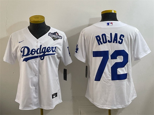 Home>MLB>Los Angeles Dodgers>Women>Women Los Angeles Dodgers 72 Miguel Rojas White 2025 World Series Home Cool Base Stitched Baseball Jersey