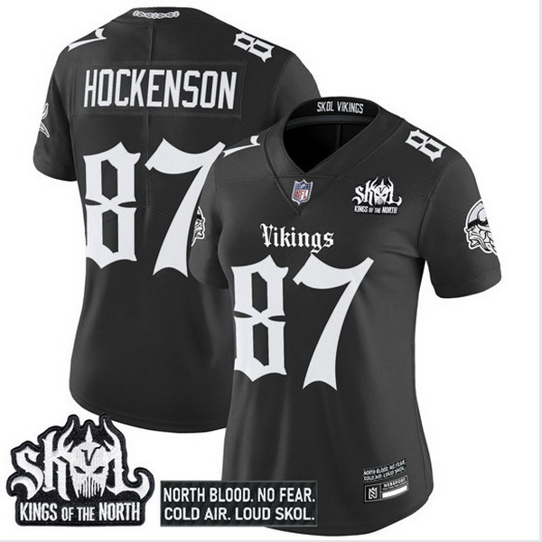 Home>NFL>Minnesota Vikings>Women>Women Minnesota Vikings 87 T J Hockenson Black 2025 Kings of the North Patch Gothic Norseblood Edition Vapor Untouchable Limited Stitched Football Jersey