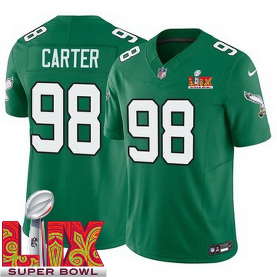 Home>NFL>2024 2025 Super Bowl LIX>Philadelphia Eagles>Youth Philadelphia Eagles Jalen Carter #98 Kelly Green 2024 2025 Super Bowl LIX F U S E Stitched NFL Jersey