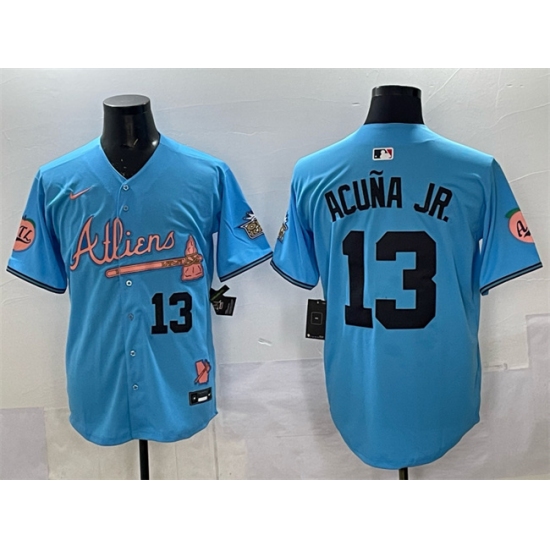 Home>MLB>Atlanta Braves>Men>Men Atlanta Braves 13 Ronald Acua Jr Blue 2024 Atliens 26 Peach With Outkast Patch Vapor Limited Stitched Baseball Jersey