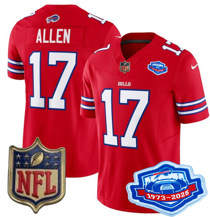 Men Buffalo Bills 17 Josh Allen Red 2025 F U S E Farewell Season Gold Shield Patch Stitched Football Jersey