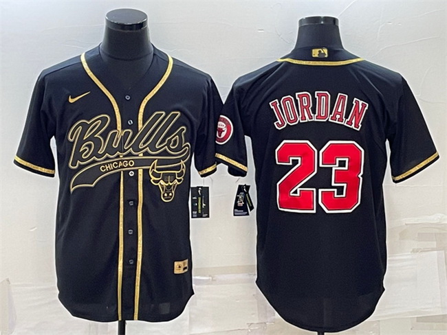 Men Chicago Bulls 23 Michael Jordan Black Gold With Patch Cool Base Stitched Baseball Jersey