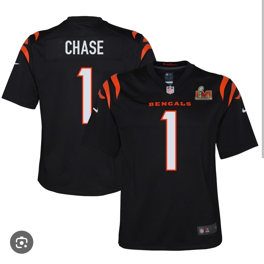 Home>NFL>Cincinnati Bengals>Men>Men Cincinnati Bengals 1 Ja'Marr Chase Black 2023 F U S E Stitched With Super Bowl Patch Football Jersey