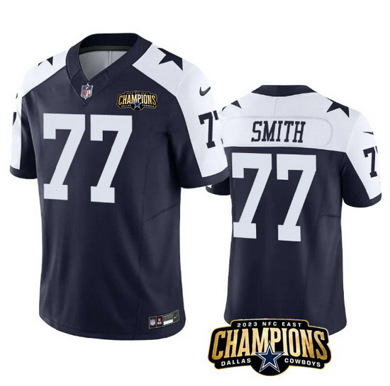 Men Dallas Cowboys 77 Tyron Smith Navy White 2023 F U S E NFC East Champions Patch Stitched Football Jersey