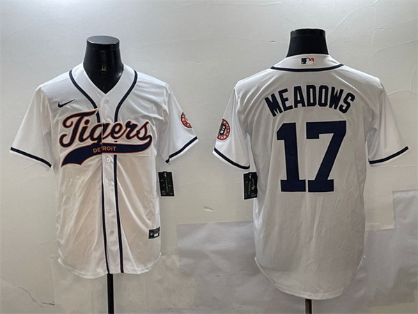 Men Detroit Tigers 17 Parker Meadows White With Patch Cool Base Stitched Baseball Jersey