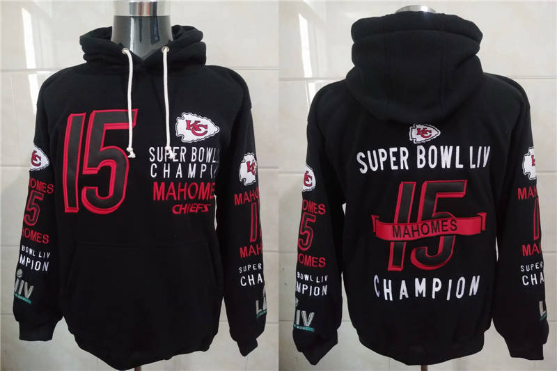 Men Kansas City Chiefs Patrick Mahomes 15 Super Bowl LIV Champion Black Stitched Hoodie