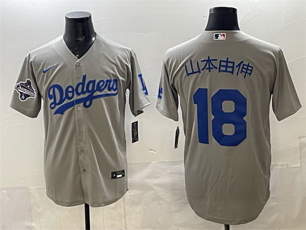 Home>MLB>Los Angeles Dodgers>Men>Men Los Angeles Dodgers 18 Yoshinobu Yamamoto Grey 2025 World Series Champions Patch Cool Base Stitched Baseball Jersey