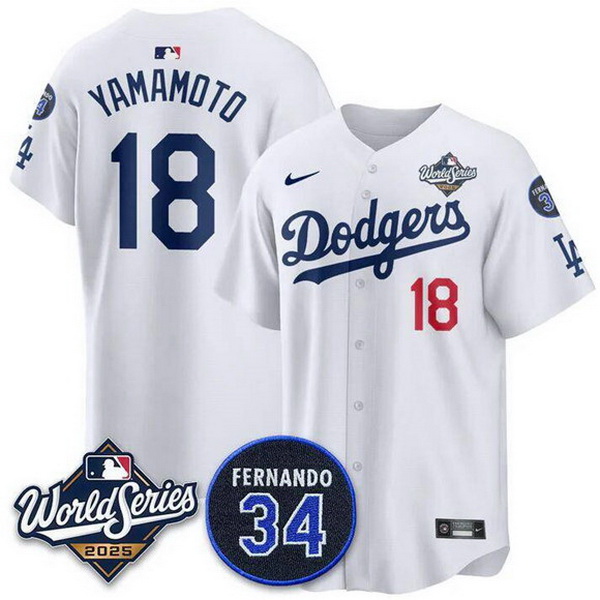 Men Los Angeles Dodgers 18 Yoshinobu Yamamoto White 2025 World Series With No 34 Patch Home Limited Stitched Baseball Jersey