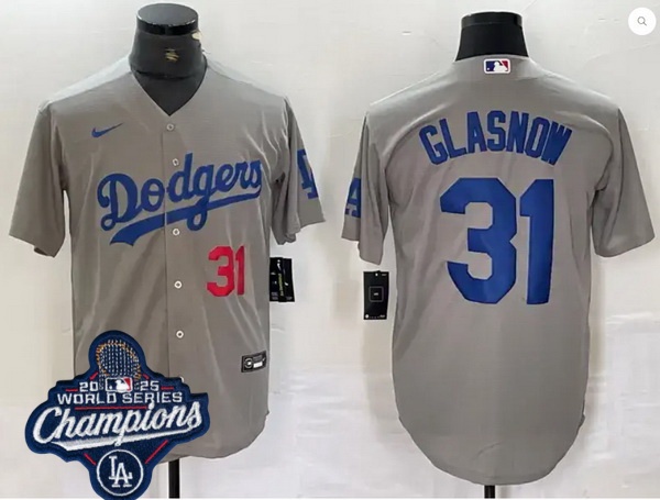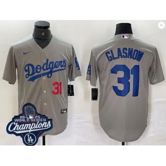 Men Los Angeles Dodgers 31 Tyler Glasnow Cool Base 2025 World Champions Stitched Baseball Jersey Gray