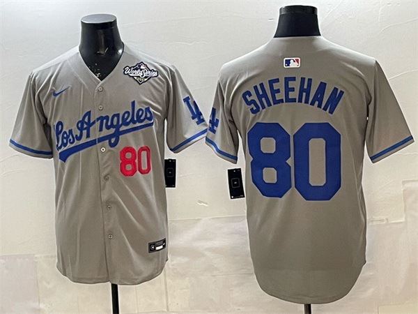 Home>MLB>Los Angeles Dodgers>Men>Men Los Angeles Dodgers 80 Emmet Sheehan Grey 2025 World Series Patch Limited Stitched Baseball Jersey