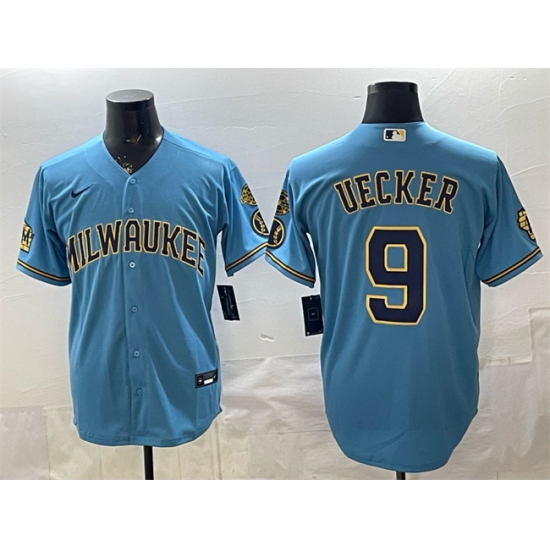 Men Milwaukee Brewers 9 Bob Uecker Blue With Home Bob Uecker Patch Stitched Baseball Jersey