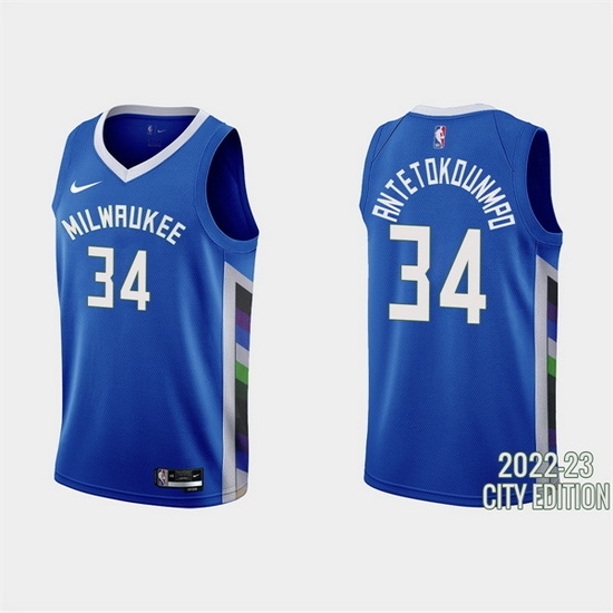 Home>NBA>Milwaukee Bucks>Men>Men Milwaukee Bucks 34 Giannis Antetokounmpo 2022 23 Blue City Edition Stitched Basketball Jersey