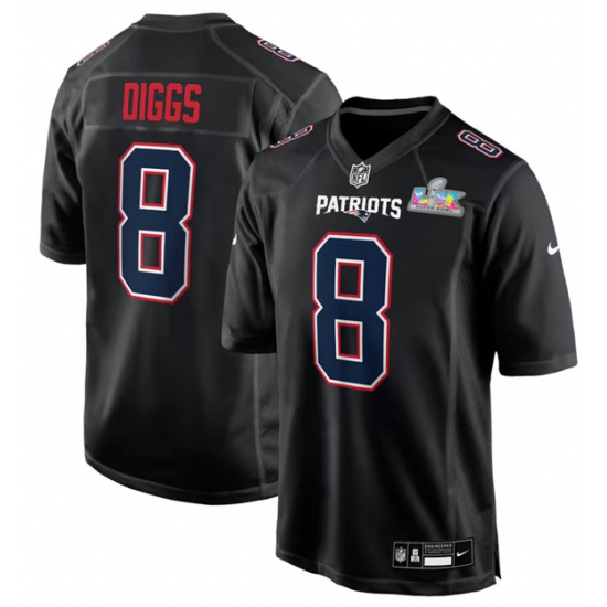 Men New England Patriots 8 Stefon Diggs Black 2025 Super Bowl LX Patch Carbon Fashion Stitched Game Jersey