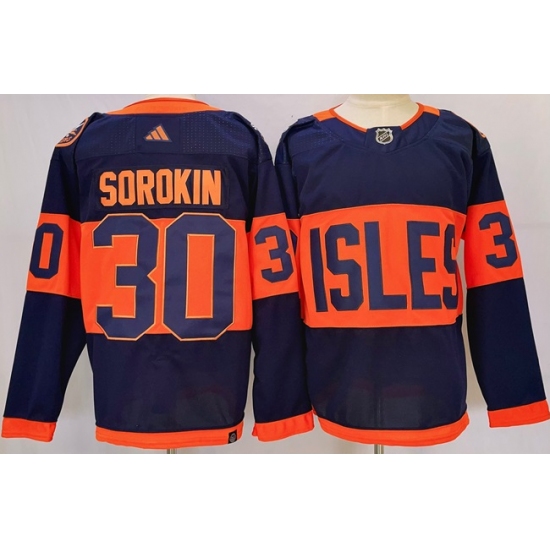 Men New York Islanders 30 Ilya Sorokin Navy 2024 With Stadium Series Patch Stitched Jersey