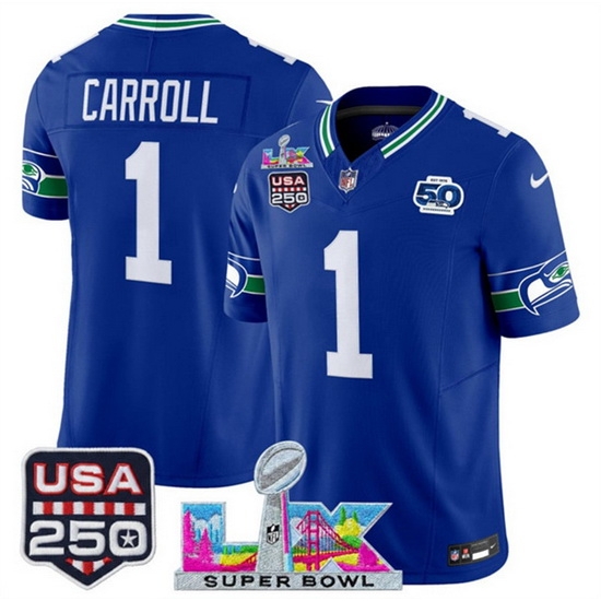 Men Seattle Seahawks 1 Pete Carroll Royal 2025 F U S E Super Bowl LX Patch And 50th Season USA 250 Patch Vapor Throwback Limited Stitched Football Jersey
