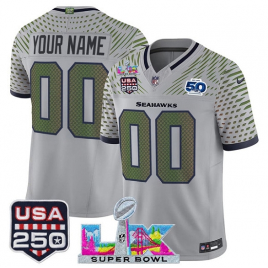 Home>Customized>NFL Customized>Seattle Seahawks>Men Seattle Seahawks Active Player Custom Gray 2025 F U S E Super Bowl LX US 250th anniversary Patch And 50th Season Patch Rivalries Vapor Limited Footbal
