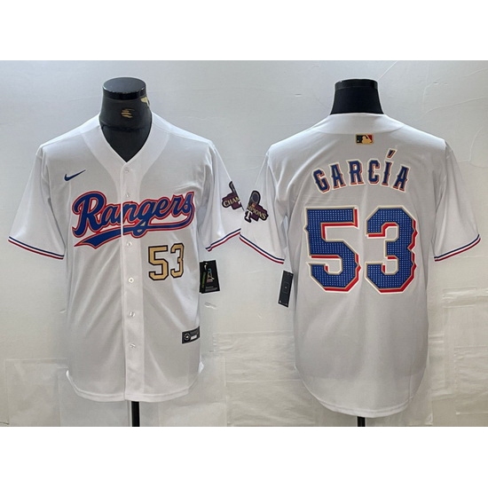 Men Texas Rangers 53 Adolis Garcia Number White 2023 World Series Champions Cool Base Jerseys