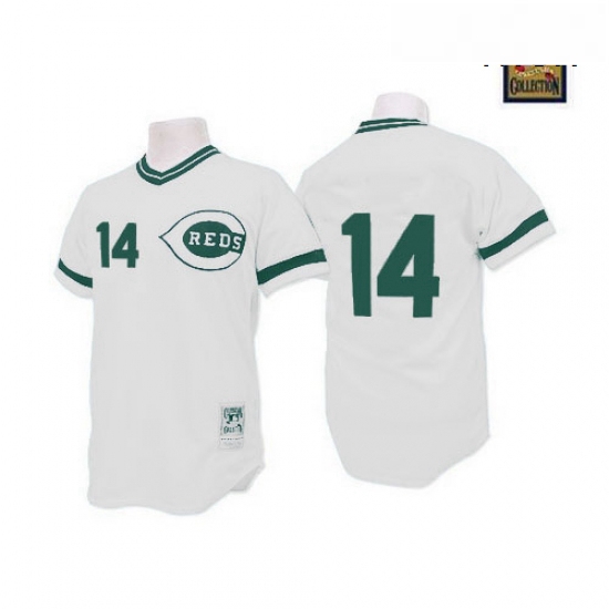 Mens Mitchell and Ness Cincinnati Reds 14 Pete Rose Replica WhiteGreen Patch Throwback MLB Jersey