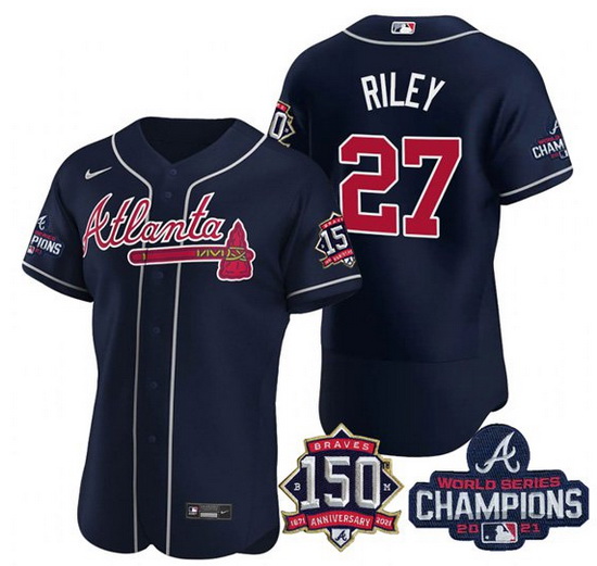 Men's Navy Atlanta Braves #27 Austin Riley Swanson 2021 World Series Champions With 150th Anniversary Flex Base Stitched Jersey