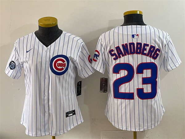 Women Chicago Cubs 23 Ryne Sandberg White Pinstripe Ryne Sandberg Tribute Vapor Limited V2 Stitched Baseball Jersey