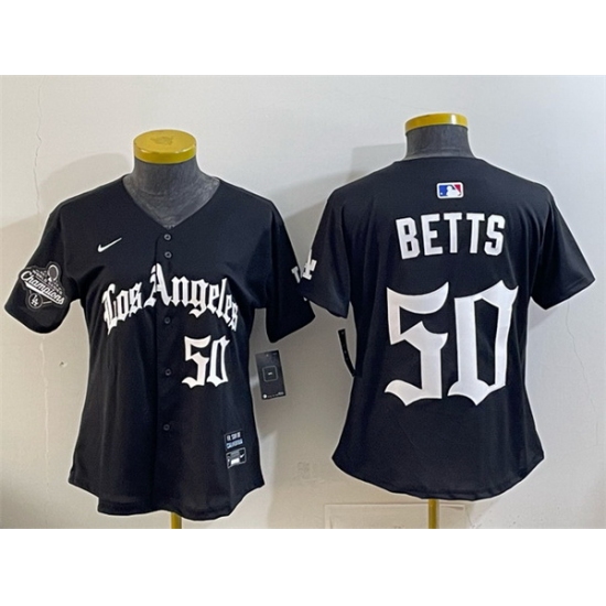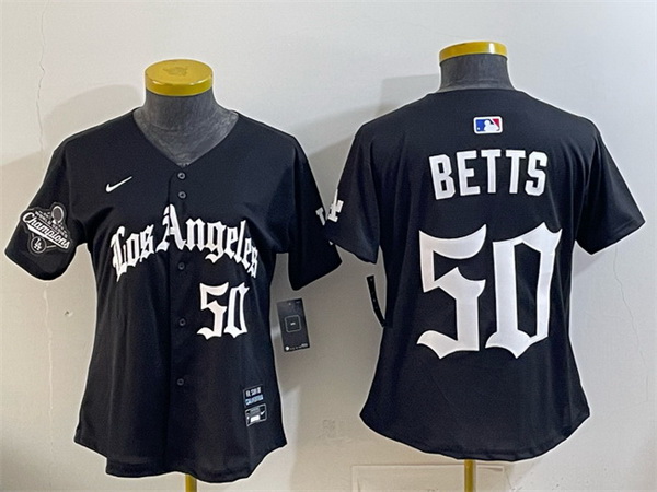 Women Los Angeles Dodgers 50 Mookie Betts Black 2025 World Series Champions LA Gothic Edition Limited Stitched Baseball Jersey