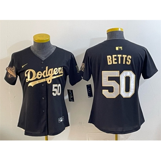 Women Los Angeles Dodgers 50 Mookie Betts Black Gold 2025 World Series Champions Patch Limited Stitched Baseball Jersey