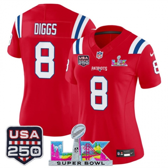 Home>NFL>2025 2026 Super Bowl LX>New England Patriots>Women New England Patriots 8 Stefon Diggs Red 2025 F U S E Super Bowl LX Patch And USA 250 27 Patch Vapor Limited Football Stitched Jersey