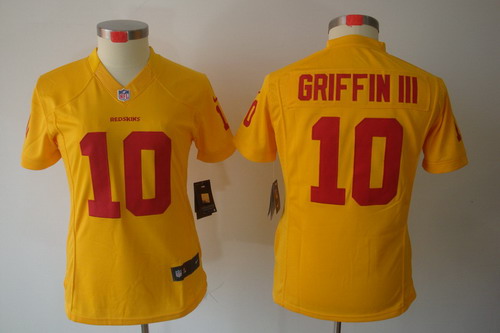 Home>NFL>Washington Commanders>Women>Women Nike Washington Redskins #10 Griffin III Yellow Color[NIKE LIMITED Jersey] 80TH Patch