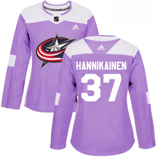 Womens Adidas Columbus Blue Jackets 37 Markus Hannikainen Authentic Purple Fights Cancer Practice NHL Jersey