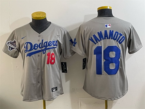 Home>MLB>Los Angeles Dodgers>Youth>Youth Los Angeles Dodgers 18 Yoshinobu Yamamoto Grey 2025 World Series Champions Patch Limited Stitched Baseball Jersey