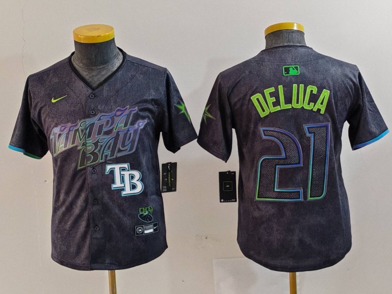 Home>MLB>Tampa Bay Rays>Youth>Youth Tampa Bay Rays 21 Jonny DeLuca Charcoal 2024 City Connect Limited Stitched Baseball Jersey 4